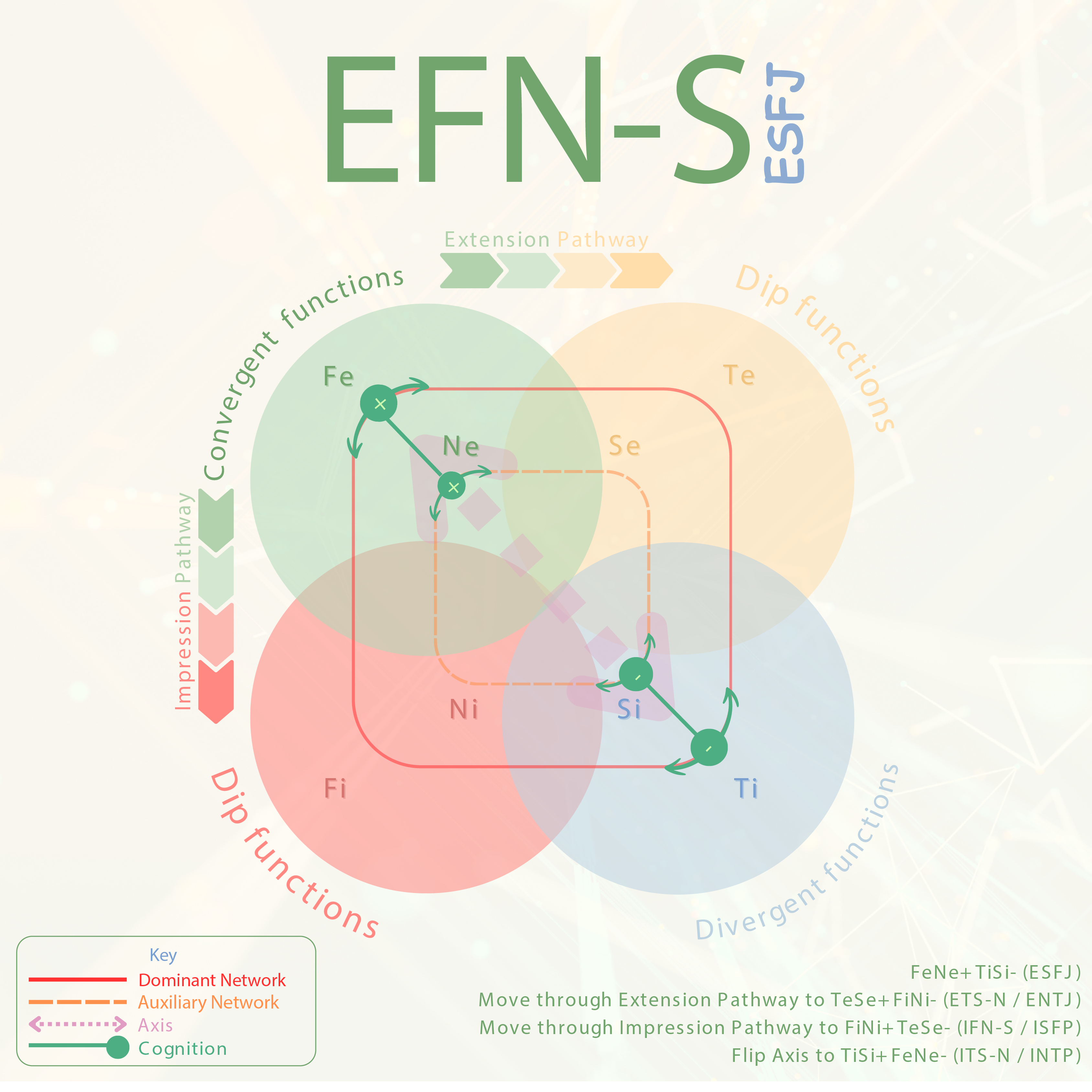 The ESFJ, also known as eFN in Cognitive Personality Theory (CPT), is a sociable and community-focused type characterised by their dominant Extraverted Feeling (Fe), agency Extraverted Intuition (Ne), authority Introverted Sensing (Si), and oppositional Introverted Thinking (Ti). This combination makes for someone who realises social potential across the contexts they are exposed to, whether it be an actual social situation or a sense of social responsibility, driven by precise and mechanistic rulesets of appropriate responses to countless variables.
