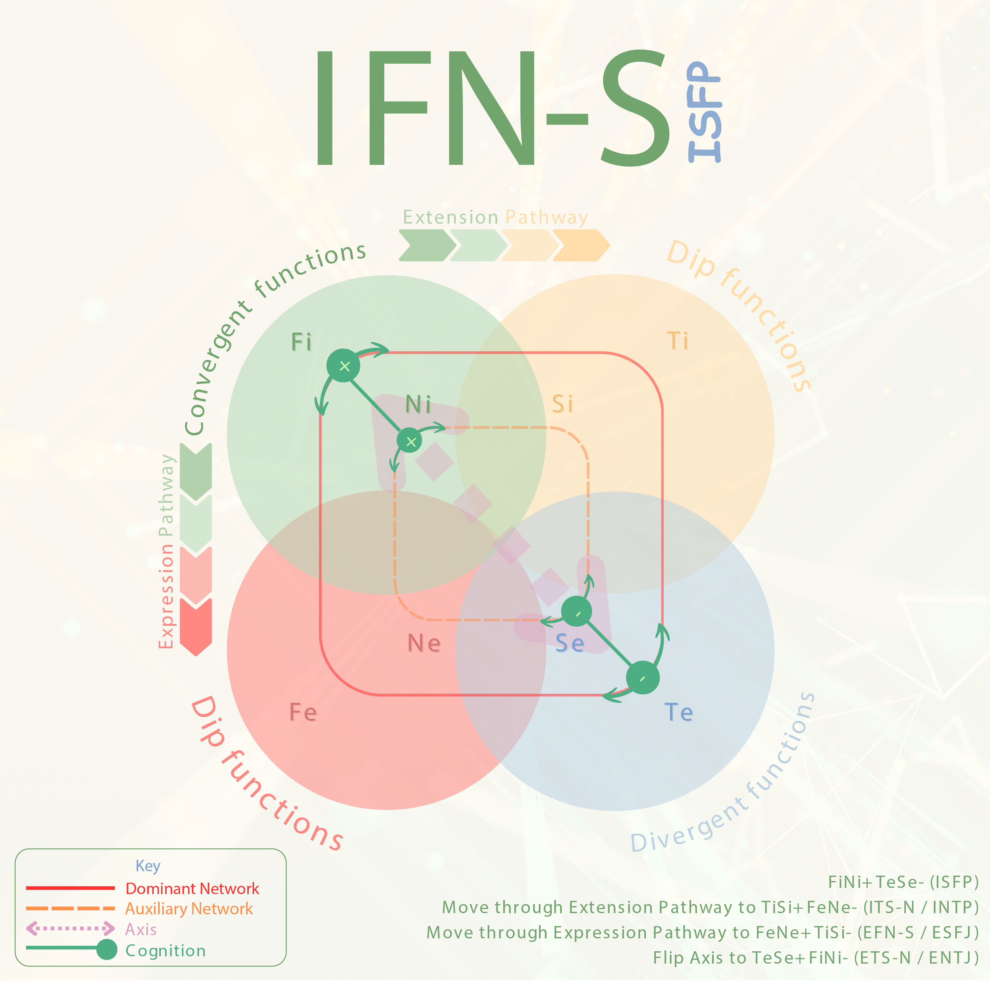 The ISFP, also known as iFN in Cognitive Personality Theory (CPT), is a deeply introspective and empathetic type characterised by their dominant Introverted Feeling (Fi), agency Introverted Intuition (Ni), authority Extraverted Sensing (Se), and oppositional Extraverted Thinking (Te). This combination makes for someone who realises emotional potential across the stimuli they are exposed to on a thematically coherent level, driven by a scrupulous TeSe- pairing measuring reality based on its ability to be impactful.