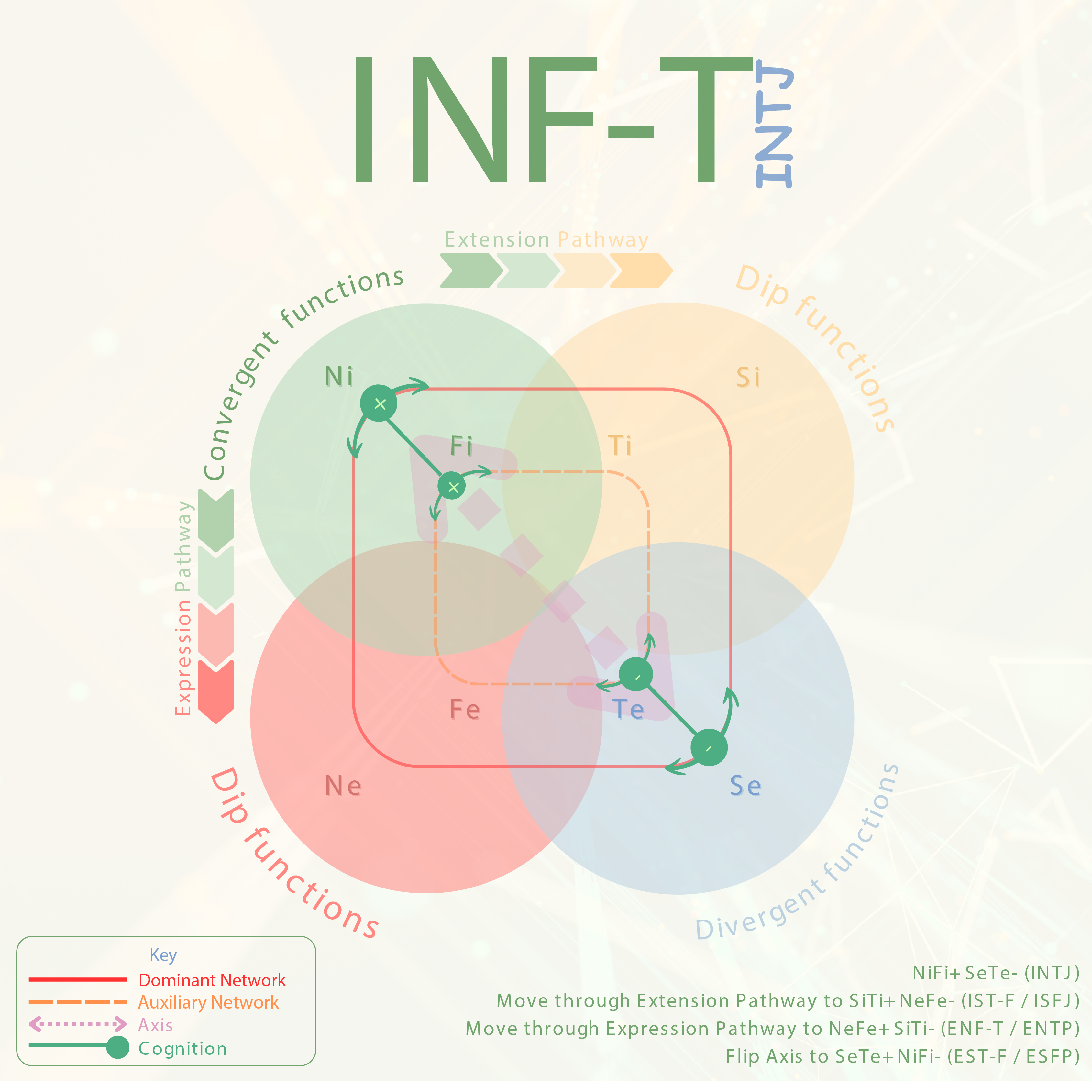 NiFi - NeFe: Expressing the internal extensity of values and destiny into the pursuit and trans-archetypal exploration of other life paths that align with them. This dip allows the INTJ to channel their refined concepts into practical and engaging activities.