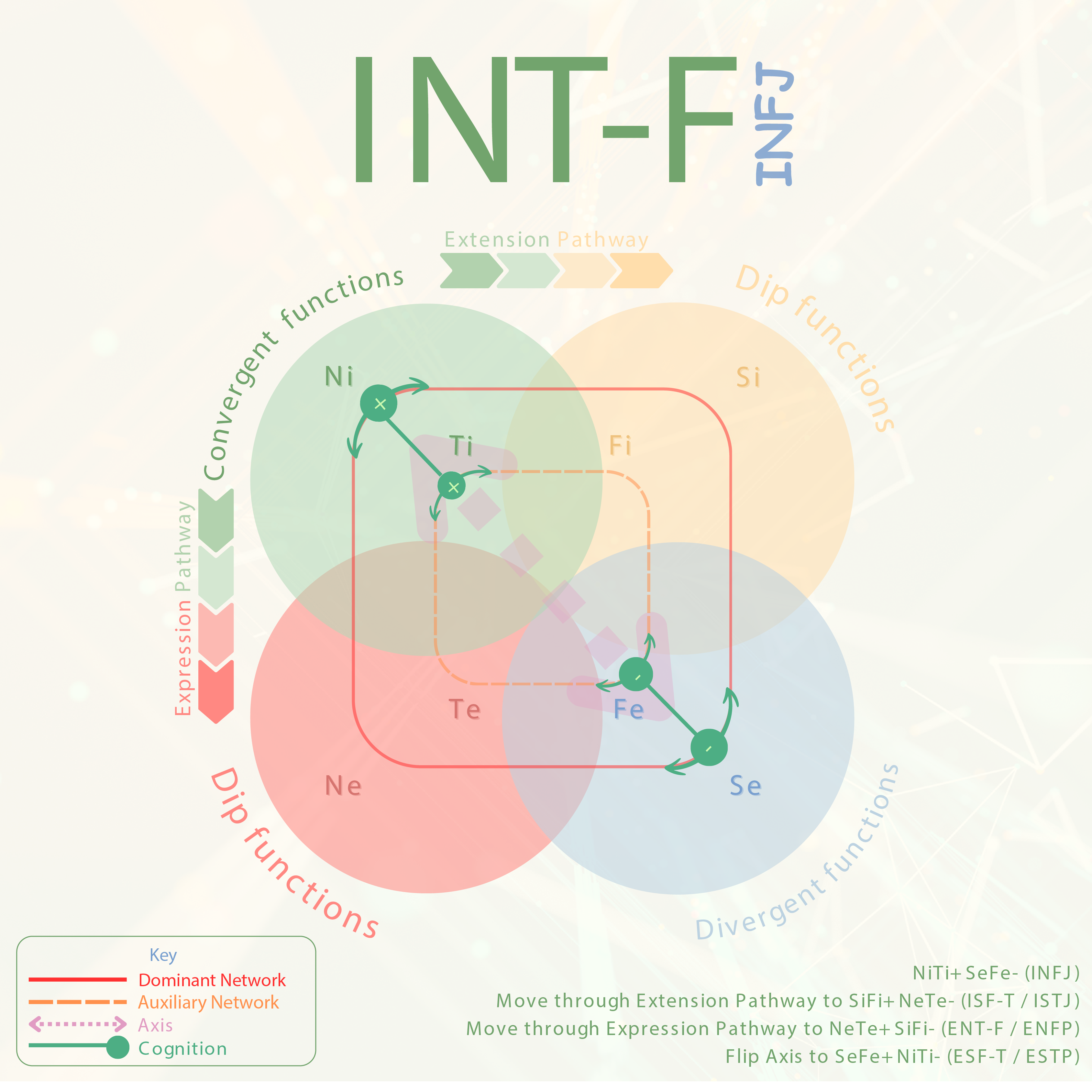 The INFJ’s cognitive dynamics are characterised by their ability to refine and maintain their internal concepts and frameworks through Ni-Ti. This type excels at creating a stable and reliable internal world, ensuring that their sense of self and understanding remains strong and consistent.