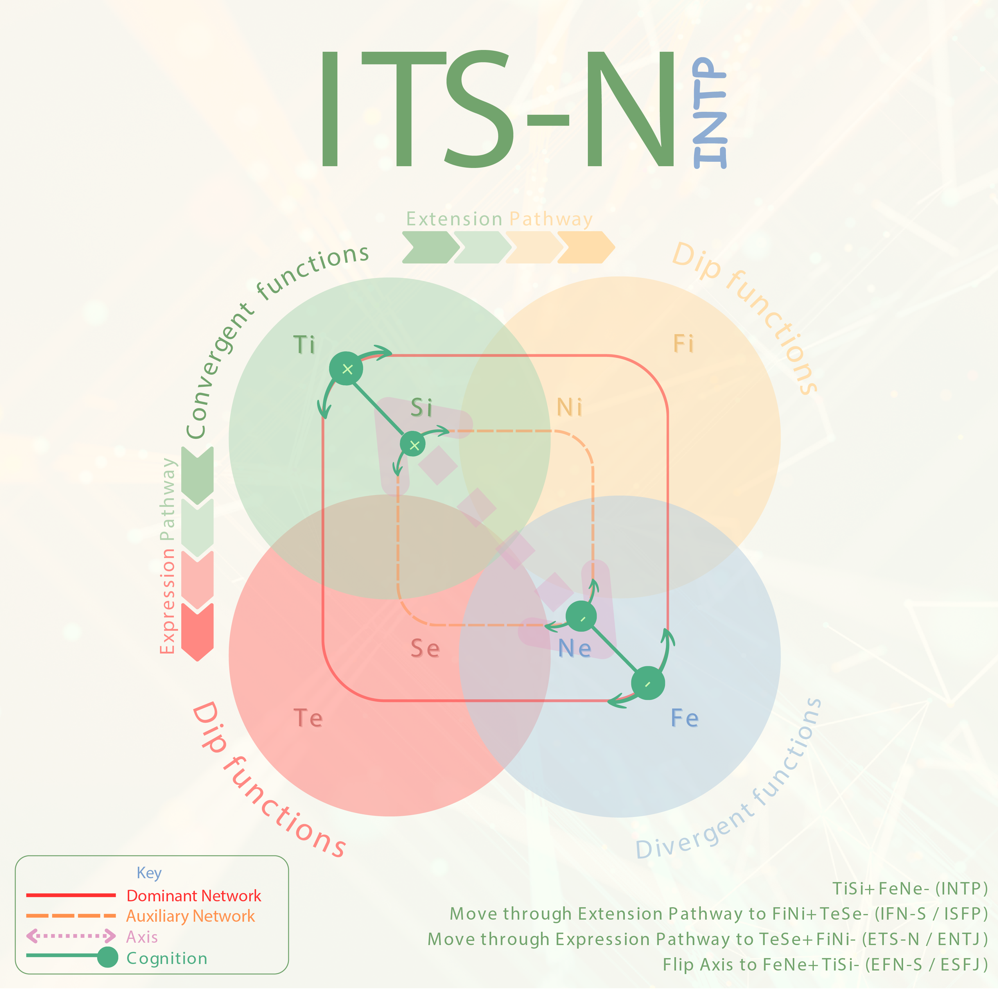 TiSi - TeSe: Execution of rehearsed mechanistic precision in the external world. This dip allows the INTP to use their dynamic presence and organisational skills to build strong relationships and alliances.